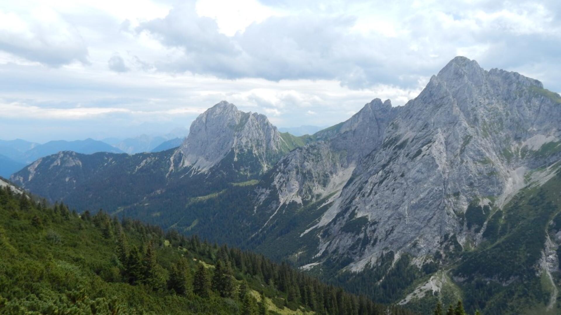 Wie auch immer… Der Aufstieg. Nach der Rast geht es weiter nach oben. Nach gut 10 Minuten erreichen wir dann den Gipfel auf 2.059 Meter Höhe. Die Endorphine frohlocken bar dem vollendeten Aufstieg. Ein herrliches Panorama breitet sich vor unseren Augen aus. Das Wetter ist nahezu perfekt, die Sicht geht auf weit entfernte Gipfel und sogar bis auf die Alpseen und Schwangau mit den Königschlössern. Einfach nur wunderschön! Wir rasten und ruhen und genießen die Eindrücke, einfach nur zufrieden mit uns und dem Moment.