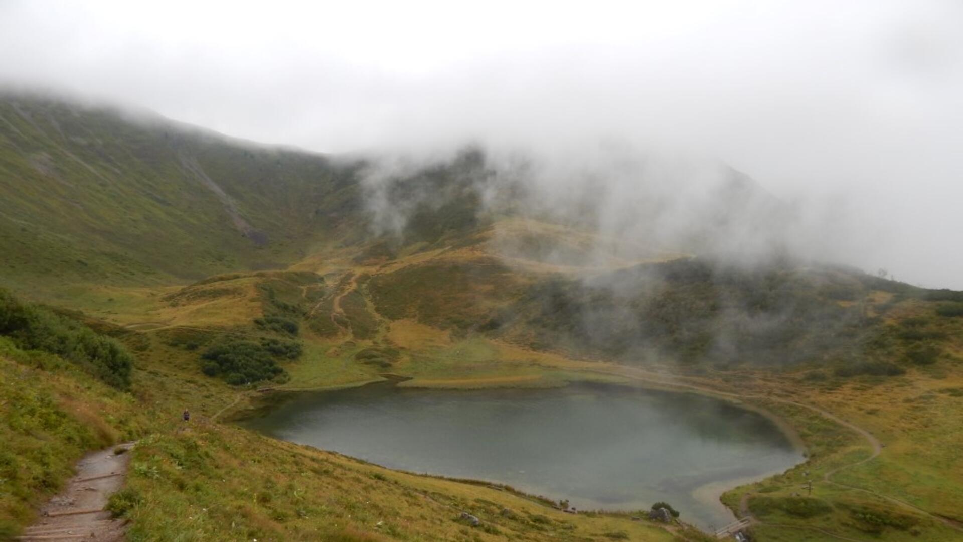Weiter geht's bergauf. Entlang betonierten Wegen. Die Tour ist mehr Anstrengung als Erlebnis. Es hilft eigentlich nur an die Belohnung in Form des der Mittelstation mit ihrem daneben liegenden Alpsee zu denken. Beides erreichen wir nach gut 45 Minuten. Der Anblick des Schlappoldsees ist herrlich, das muss man ihm lassen. Auf jeden Fall endlich mal ein gutes Motiv vor der Kamera. Da mein Kreislauf etwas nachgibt nutze ich also die Gelegenheit und halte das Szenario fest. Sicherlich aber bei gutem Wetter um einiges beeindruckender. Aber man soll sich ja über das freuen was man hat. Und überhaupt können wir echt stolz sein über das Geleistetet, denn 870 Höhenmeter macht man auch nicht jeden Tag! In der Mittelstation angekommen fröhnen wir noch einigen Leckereien in Form von Gulaschsuppen und Kuchen. Lohnt sich auf jeden Fall und haben wir uns verdient! 🙂
